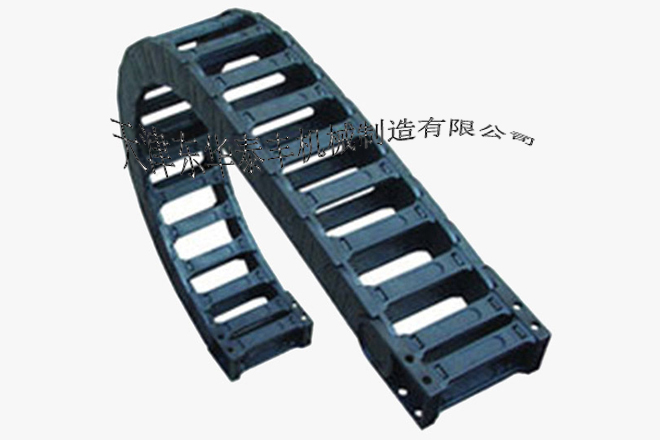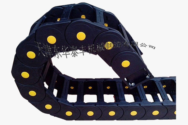 ? 拖鏈外形似坦克鏈,由眾多單元鏈節組成,鏈節之間轉動自如。相同系列的拖鏈內高、外高、節距相同,拖鏈內高、彎曲半徑R可有不同的選擇。單元鏈節由左右鏈板和上下蓋板組成,拖鏈每節都能打開,裝拆方便,不必穿線,打開蓋板后即可把電纜、油管、氣管等放入拖鏈內。